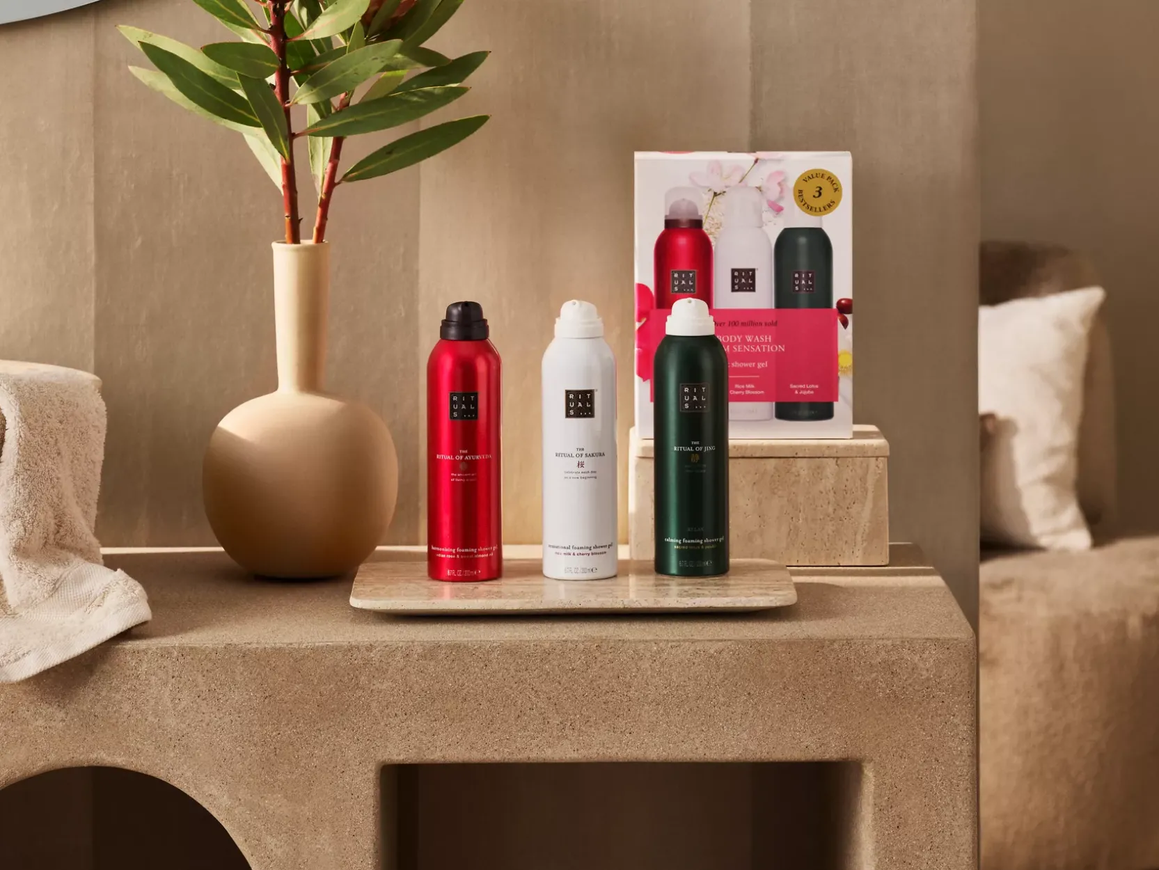 The Ritual of Ayurveda Foaming Shower Gel: Aqua/Water, Sodium Coco-Sulfate, Decyl Glucoside, Isopentane, Coco-Glucoside, Glycerin, PEG-120 Methyl Glucose Dioleate, Isopropyl Palmitate, Parfum/Fragrance, Isobutane, Rosa Damascena Flower Oil, Prunus Amygdalus Dulcis (Sweet Almond) Oil, Citric Acid, Sodium Benzoate, Guar Hydroxypropyltrimonium Chloride, Hexyl Cinnamal, Limonene, Linalool, Coumarin, Citronellol, Benzyl Benzoate.The Ritual of Jing Foaming Shower Gel: Aqua/Water, Sodium Laureth Sulfate, Cocamidopropyl Betaine, Isopentane, Sorbitol, Parfum/Fragrance, Isopropyl Palmitate, Isobutane, PEG-120 Methyl Glucose Dioleate, Glycerin, Butylene Glycol, Nelumbo Nucifera (Lotus) Flower Extract, Ziziphus Jujuba (Jujube) Fruit Extract, Sodium Benzoate, Potassium Sorbate, Sodium Chloride, PEG-40 Hydrogenated Castor Oil, Citric Acid, Guar Hydroxypropyltrimonium Chloride, Tocopherol, Alpha-Isomethyl Ionone, Benzyl Salicylate, Hexyl Cinnamal, Linalool.The Ritual of Sakura Foaming Shower Gel: Aqua/Water, Sodium Laureth Sulfate, Cocamidopropyl Betaine, Isopentane, Sorbitol, PEG-120 Methyl Glucose Dioleate, Isopropyl Palmitate, Parfum/Fragrance, Isobutane, Oryza Sativa (Rice) Extract, Prunus Cerasus (Bitter Cherry) Extract, Sodium Benzoate, Citric Acid, PEG-40 Hydrogenated Castor Oil, Butylene Glycol, Glycerin, Guar Hydroxypropyltrimonium Chloride, Potassium Sorbate, Sorbic Acid, Hexyl Cinnamal, Benzyl Salicylate, Linalool, Coumarin, Citronellol, Geraniol, Alpha-Isomethyl Ionone, Cinnamyl Alcohol.
